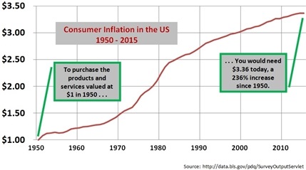 Now let’s say your goal is to make a purchase in thirty years. If inflation were 2% each year for thirty years, your $1 of savings would be worth approximately 55 cents after the thirtieth year. That is, due to inflation the money you saved under your mattress would only have 55% of its purchasing power than thirty years earlier.